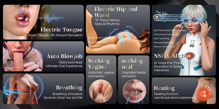 The automatic contraction and sucking system controls the contraction and relaxation of the vaginal walls or the lining of the mouth. It's just like the real thing, taking your sensual experience to the next level. Imagine: you're lying on the bed, the robot sex doll sits on your lap, you slide into the tantalizing vagina, and then the doll starts contracting and sucking. It's an intense and stimulating experience.