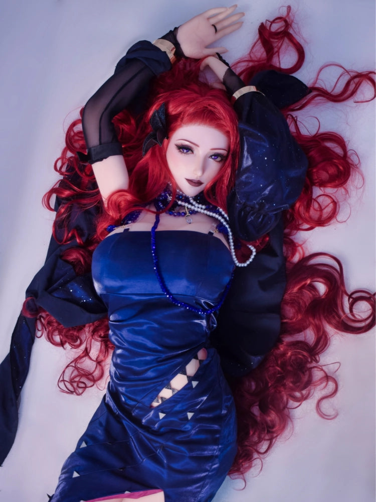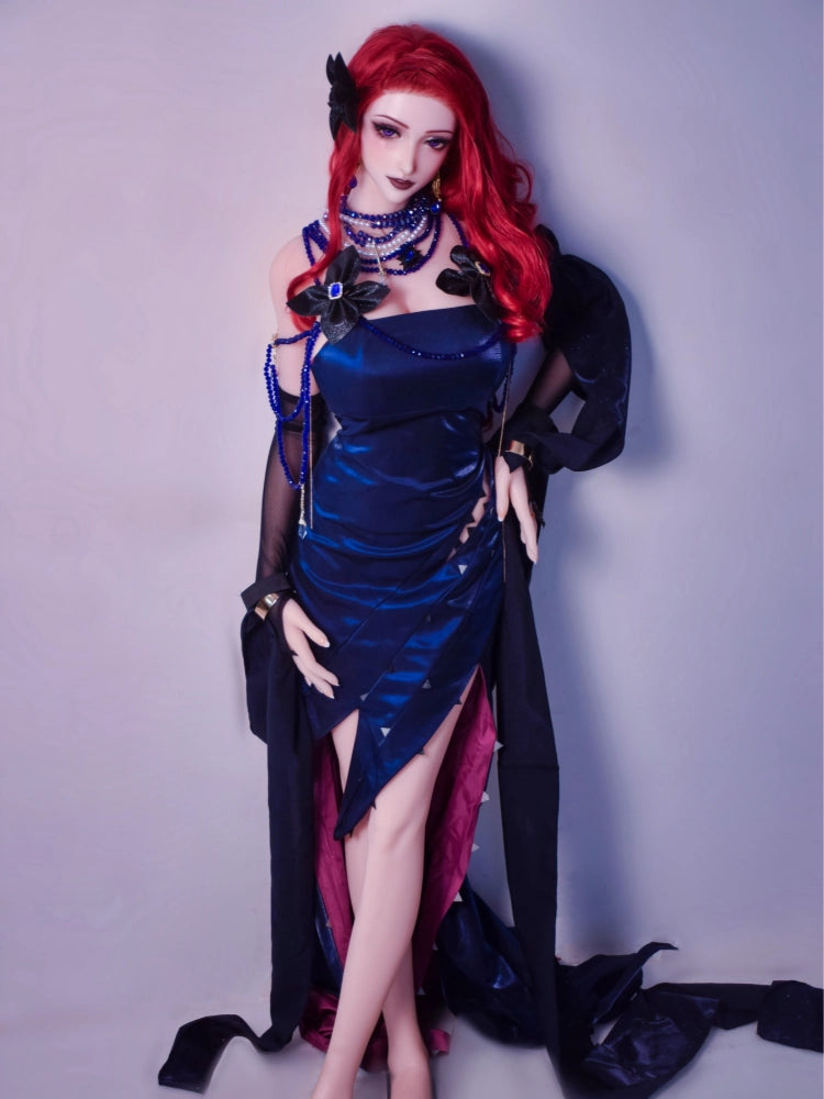 This anime sex doll has long curly red hair, exquisite makeup, a sapphire necklace and a skirt in the same color. It looks like she came out of anime. Take her home and dress her up to create your favorite look.