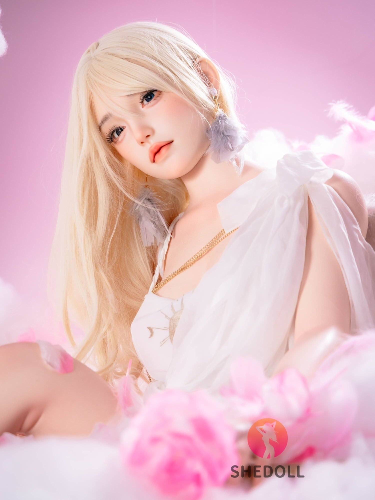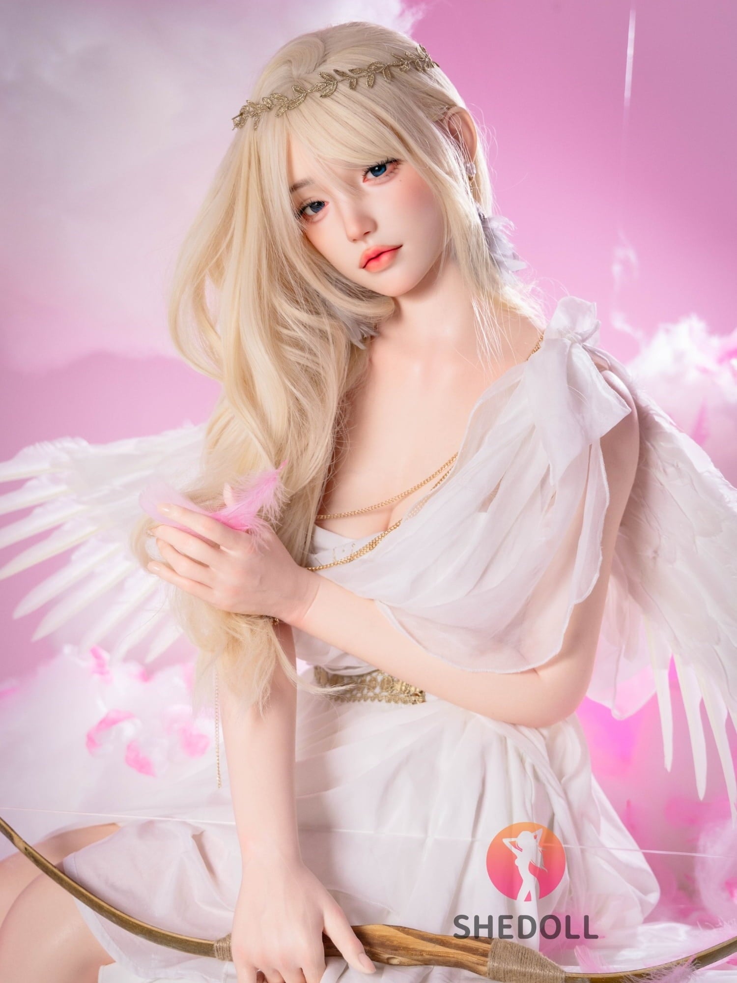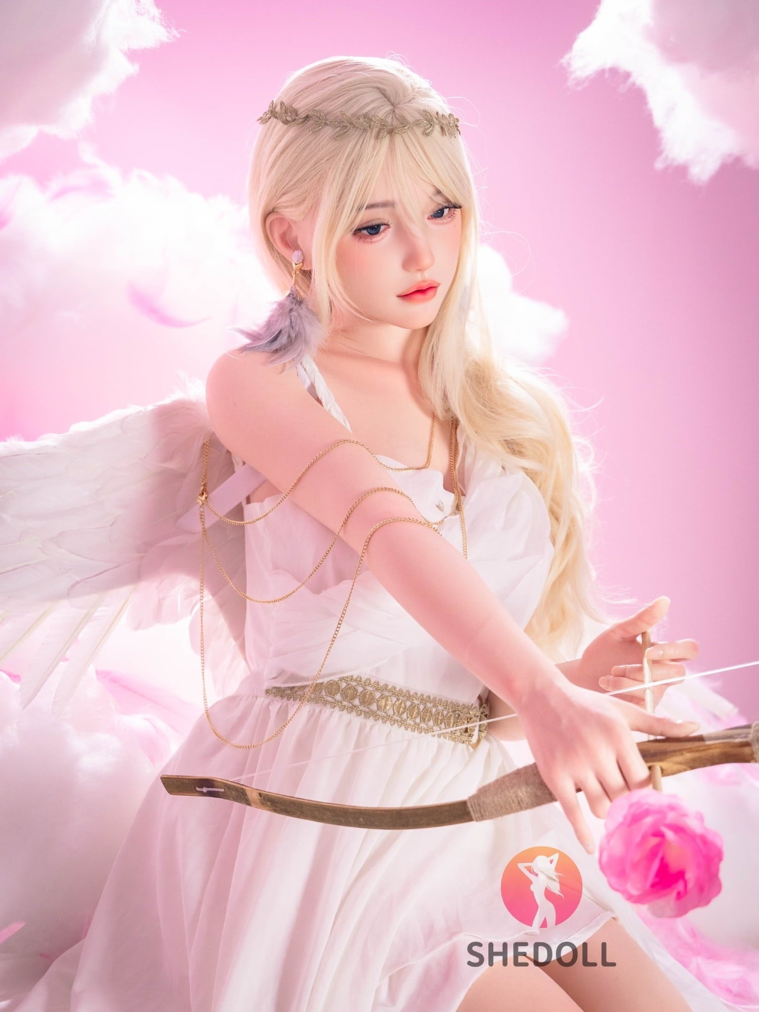 Surrounded by pink clouds and delicate petals, she appears like a goddess of love descending from the heavens, holding her bow to strike your heart with desire. As you draw closer, her clear, enchanting eyes seem to gaze right into you, waiting for your touch. She is not just a doll, but the embodiment of your deepest fantasies—soft, warm, and inviting, turning every embrace into an irresistible forbidden romance.