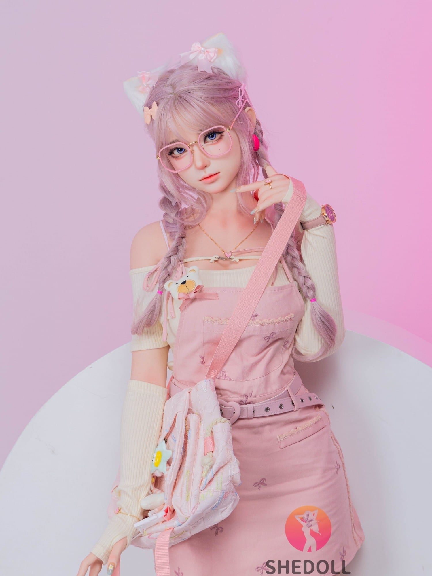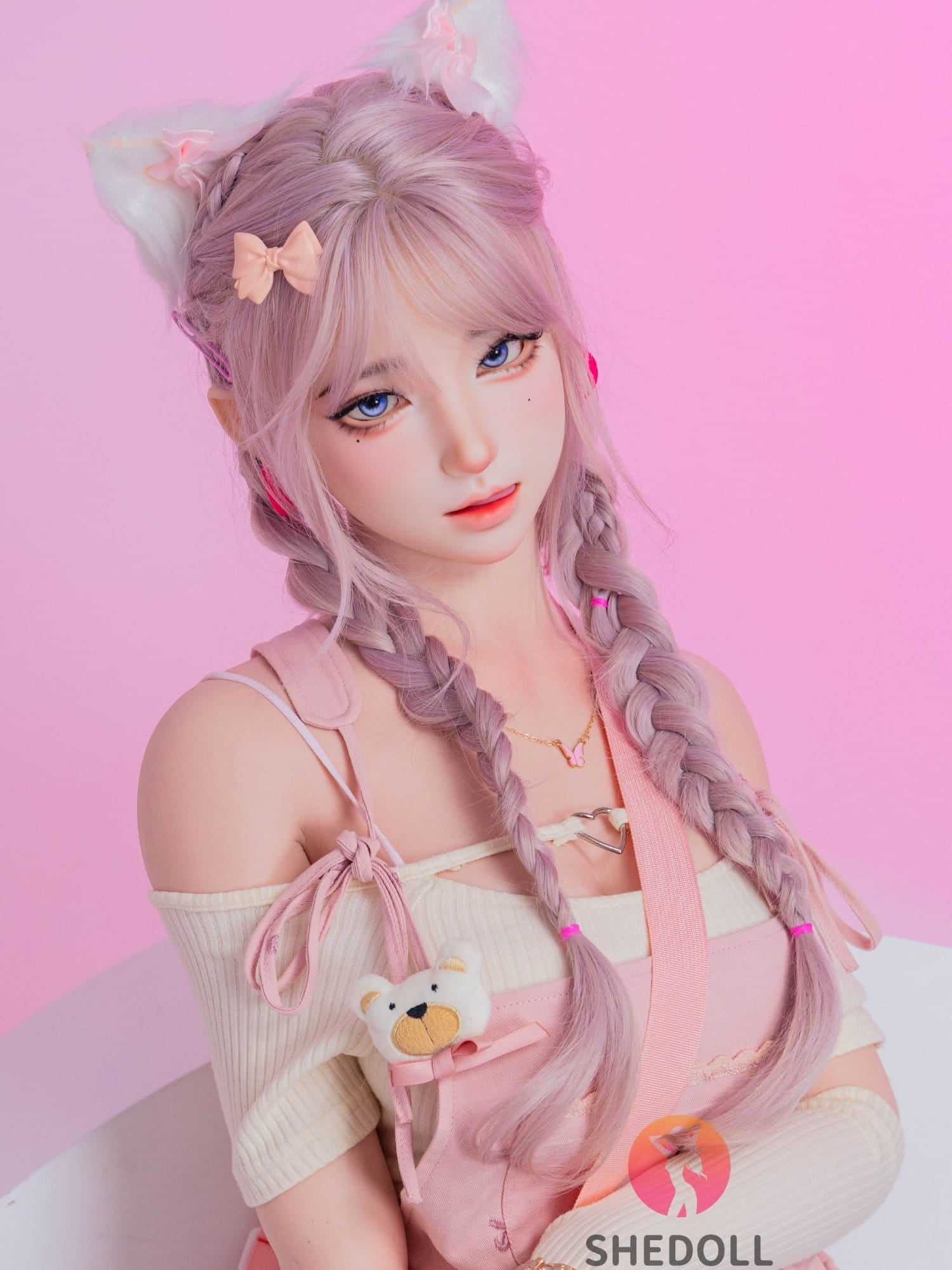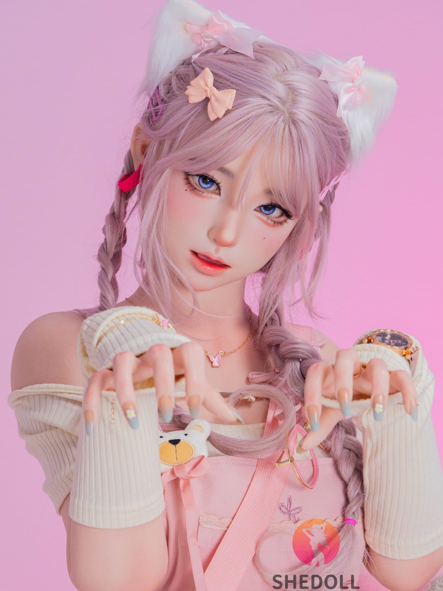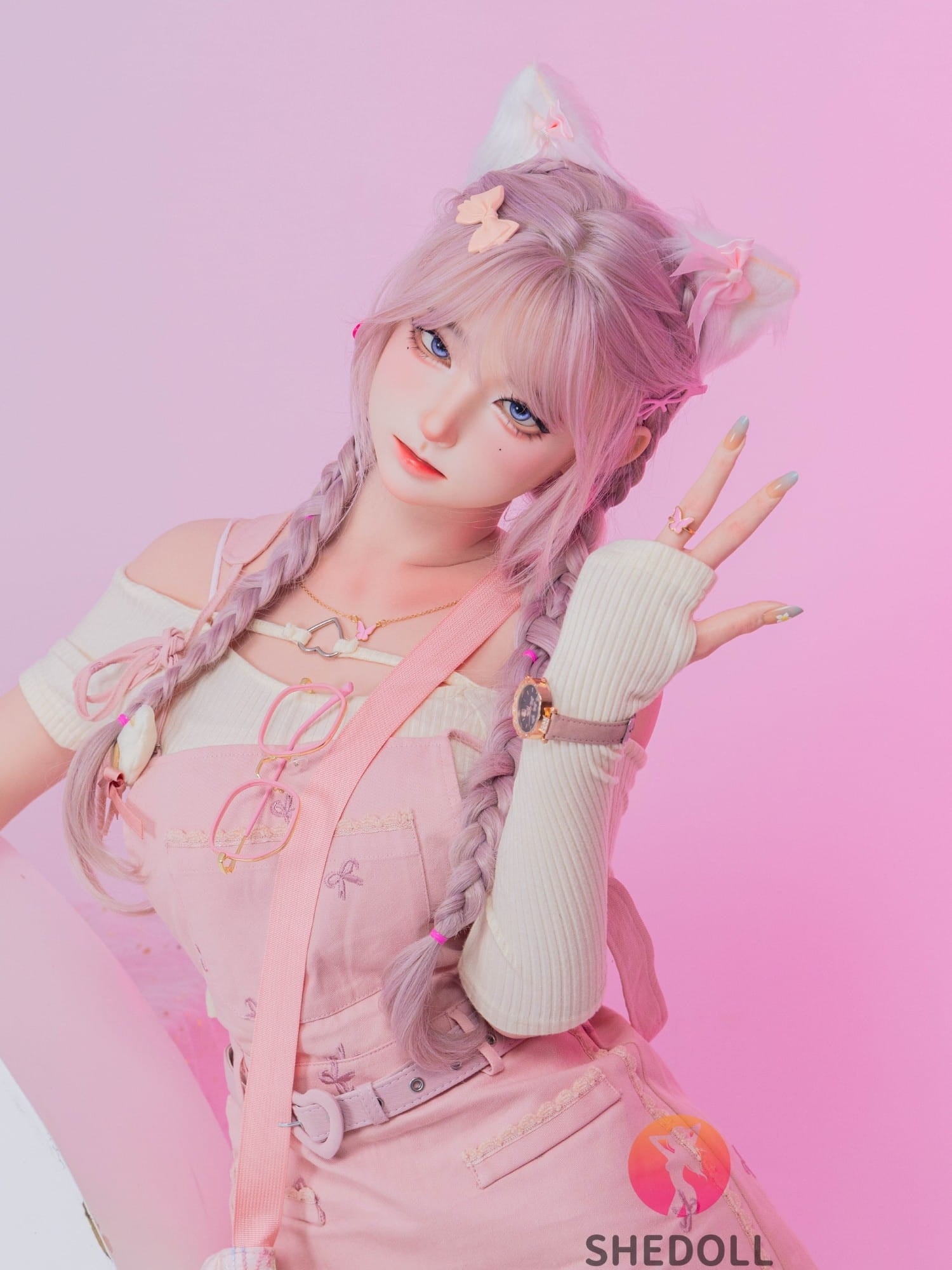 This Japanese Sex Doll is inspired by a pastel-toned anime girl, her soft lavender twin braids falling gracefully over her shoulders, paired with adorable cat ears and bow accents—like a sweetheart straight out of a dream. Dressed in a light pink overall dress, she highlights her long legs and delicate waist, radiating a gentle yet heart-throbbing charm. Crafted from premium medical-grade silicone, her skin is exquisitely smooth and warm, making every touch feel as real as caressing a living beauty.