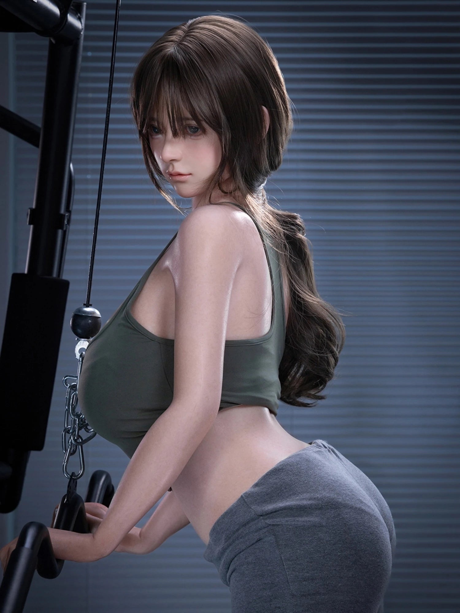 Her brunette hair is casually tied up, and her form-fitting gym outfit highlights her curves beautifully. Whether stretching on gym equipment or lifting a dumbbell with ease, she captures the attention of the whole room. Her gentle gaze occasionally meets yours, making you feel like her exclusive workout partner, with every interaction full of closeness and excitement.