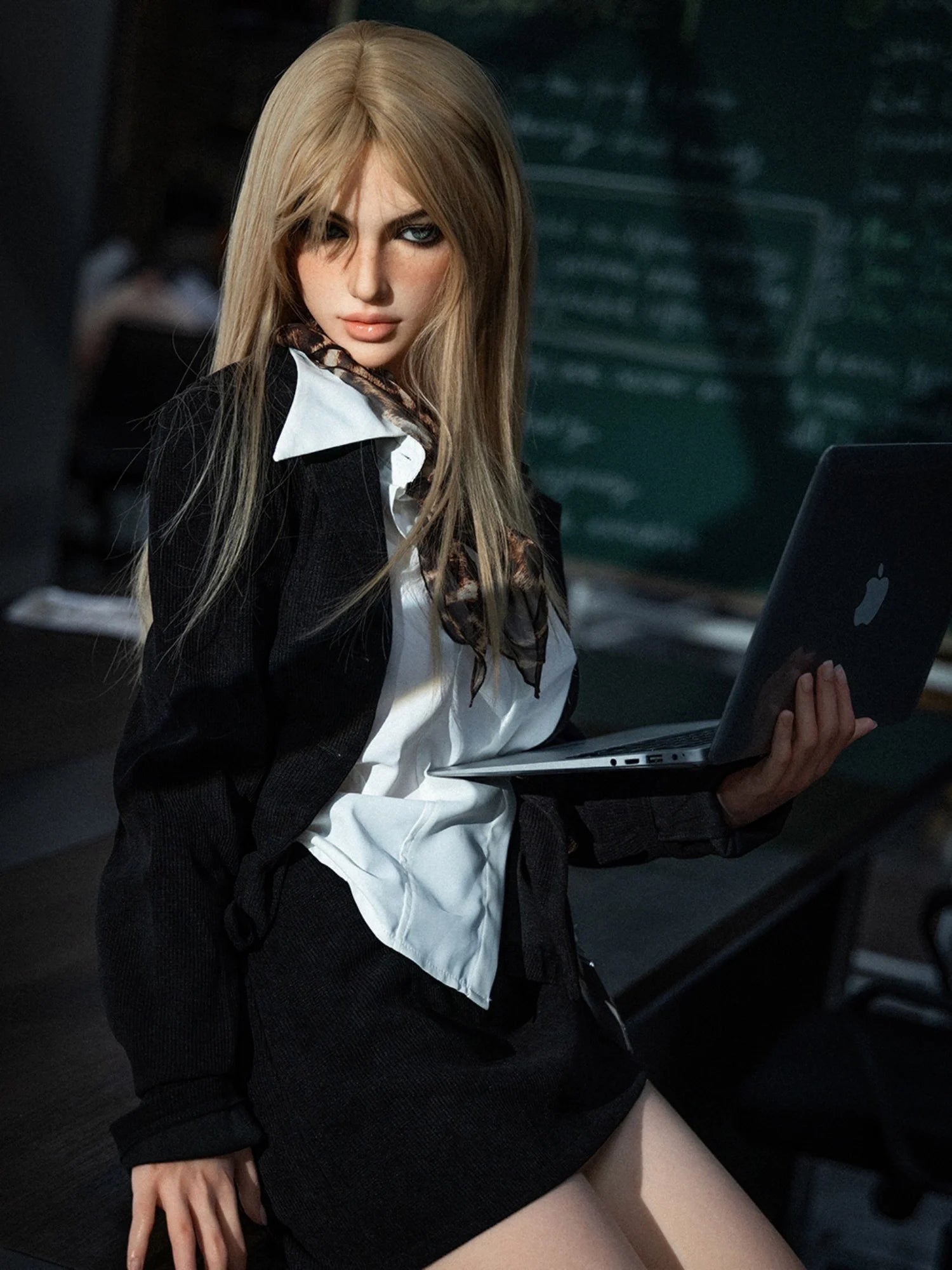 Mary’s beauty lies in the details. Her long golden hair frames a face with ice-blue eyes and a sharp, captivating gaze. Dark eyeliner, softly freckled cheeks, and full lips give her an expressive, Western-style charm. Dressed in a crisp white shirt, a tailored black blazer, and a short skirt, she exudes professional confidence with a hint of allure — like a woman who knows her power and isn’t afraid to show it.