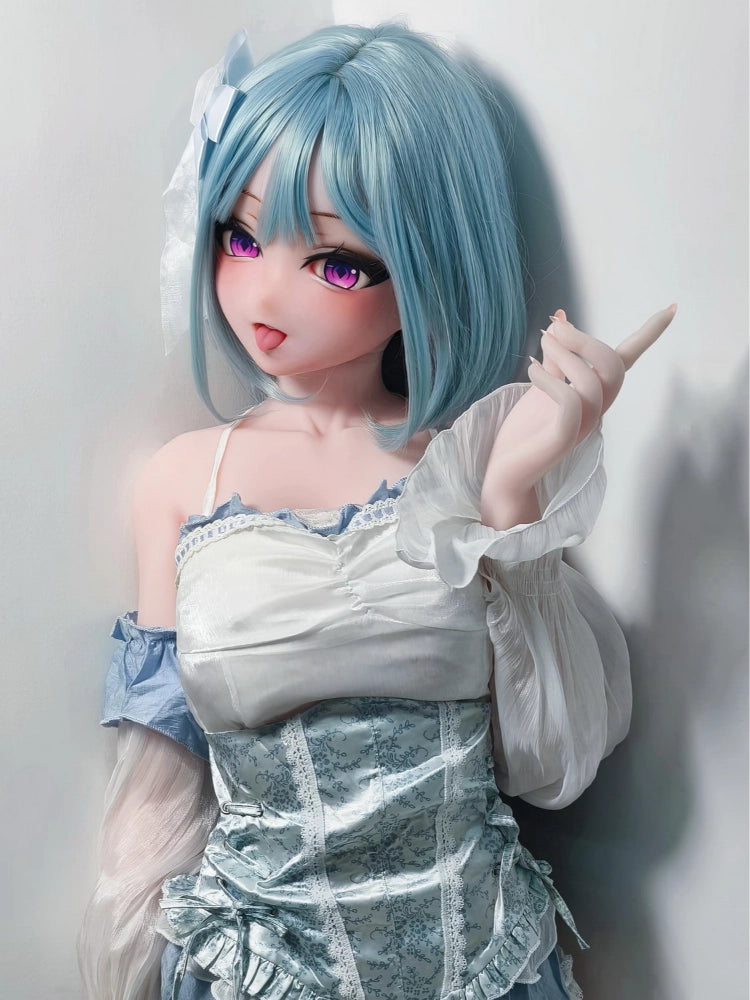 This anime sex doll features long blue hair, making it seem like it's straight out of the anime world. Her thin, curved eyebrows frame her large, watery eyes, and her pink pupils shimmer with a dreamy luster, instantly captivating her. Her delicate nose and delicate blush add a touch of cuteness to her expression. She even sticks out her pink tongue, making her look like your favorite anime heroine.