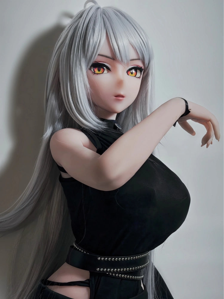 This anime sex doll features long, flowing silver hair and sparkling orange eyes, exuding an air of mystery. Her delicate features, including a small nose and mouth, create a cool, aloof, and unattainable aura. Her tight-fitting black outfit further accentuates her aloof demeanor, making her look like a goddess from the anime world, instantly captivating.