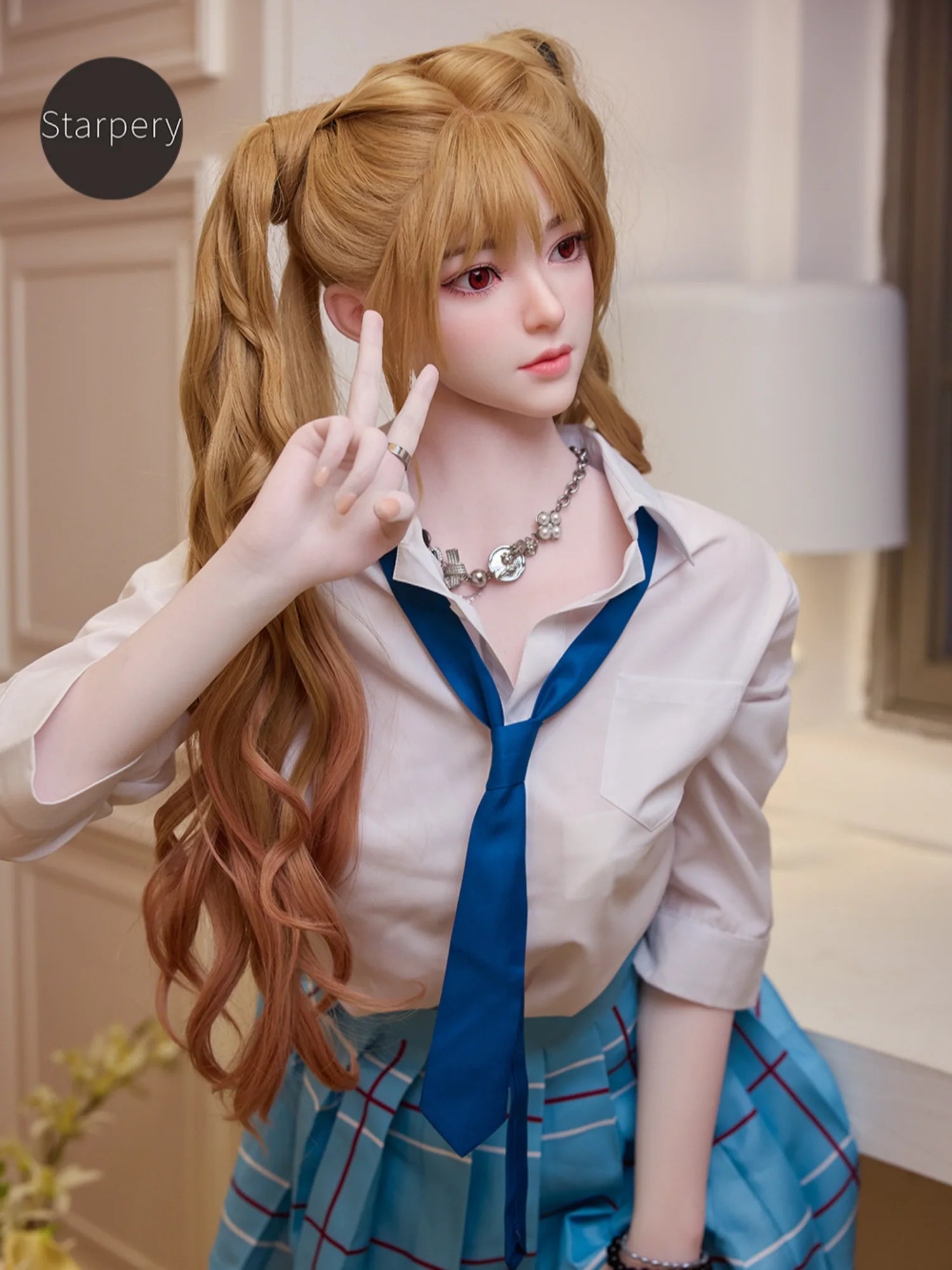 This Japanese Sex Doll stands at 163cm and weighs just 32.6kg, resembling a goddess from reality. She has long golden hair styled into playful twin ponytails, exuding youthful charm. Her facial features are exquisitely crafted: a small cherry-like mouth, crystal-clear eyes with a hint of reddish glow, and an irresistible allure. With a perfectly balanced figure—82.6cm bust, a slender 24.5cm waist, and curvy 91cm hips—she radiates both sensuality and elegance.