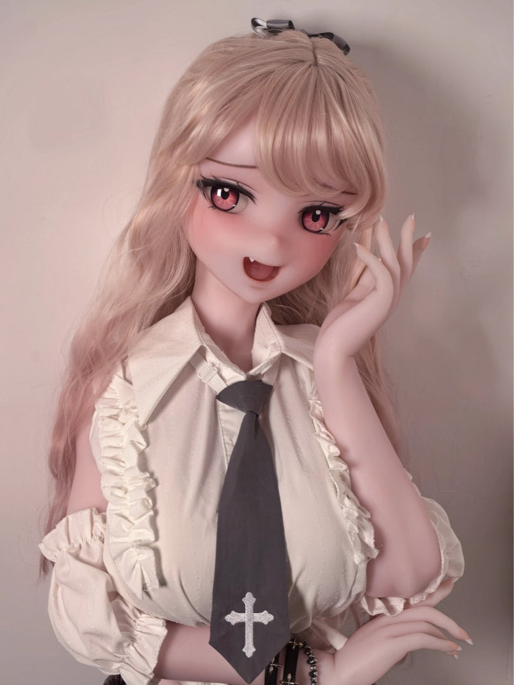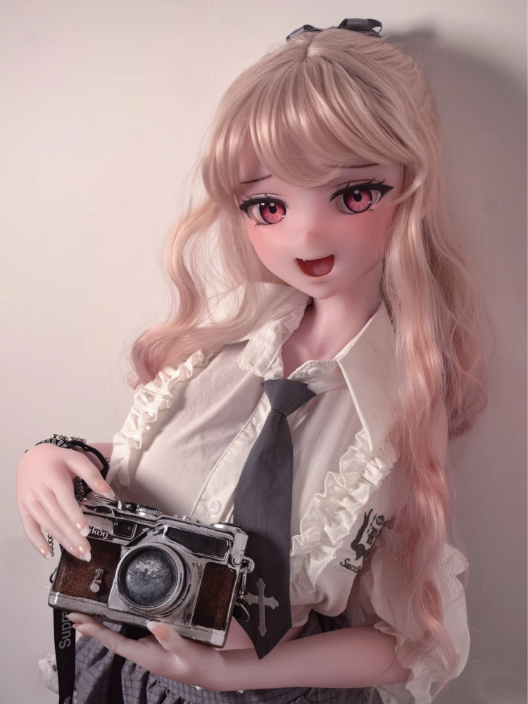 This anime style sex doll has long curly blond hair, big eyes and a small nose like a two-dimensional character, a slightly open mouth, revealing playful little tiger teeth, and pink pupils that make people excited. The whole character is sweet and lovable, as if it came out of the anime world.