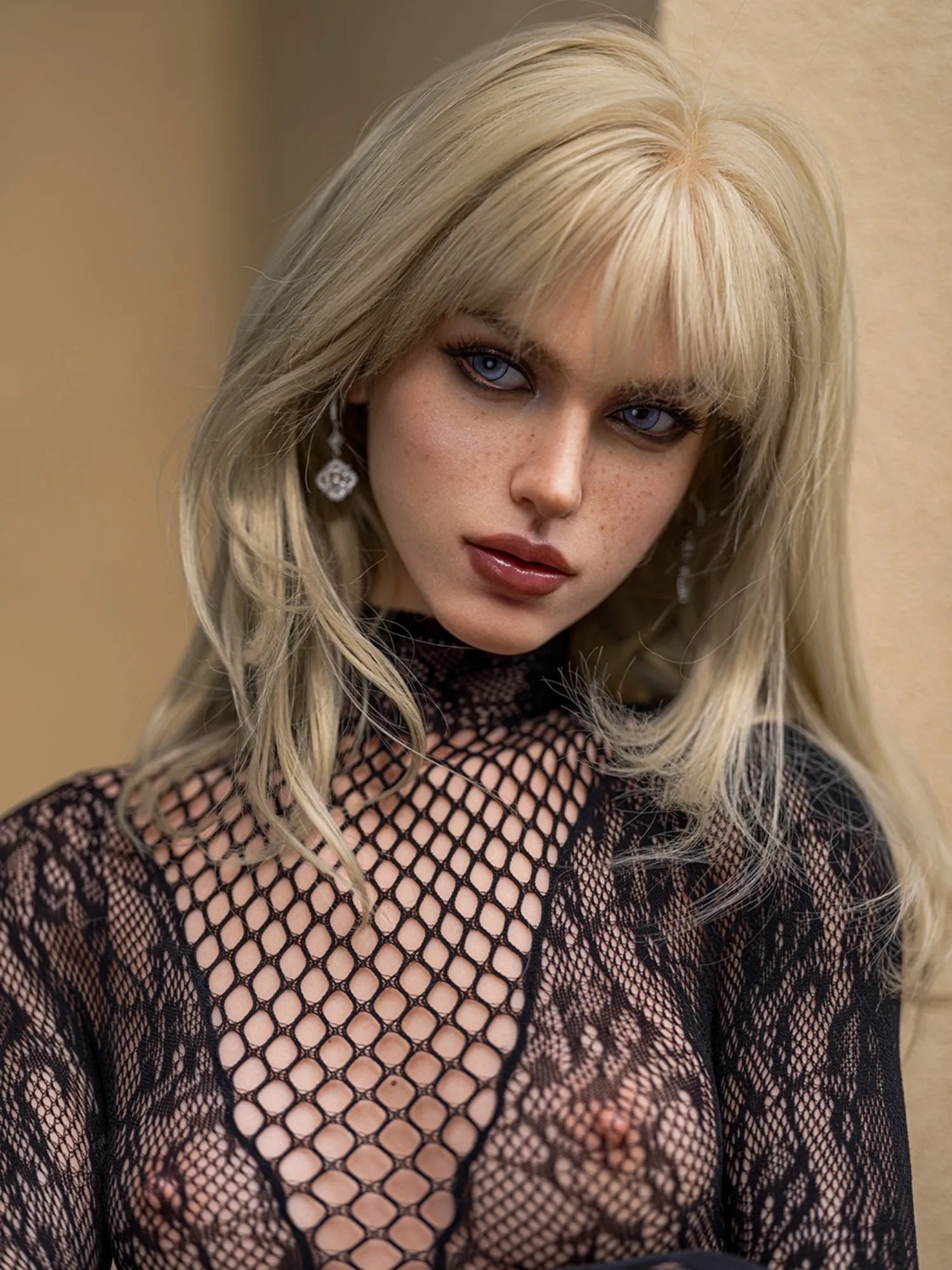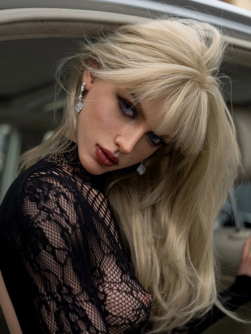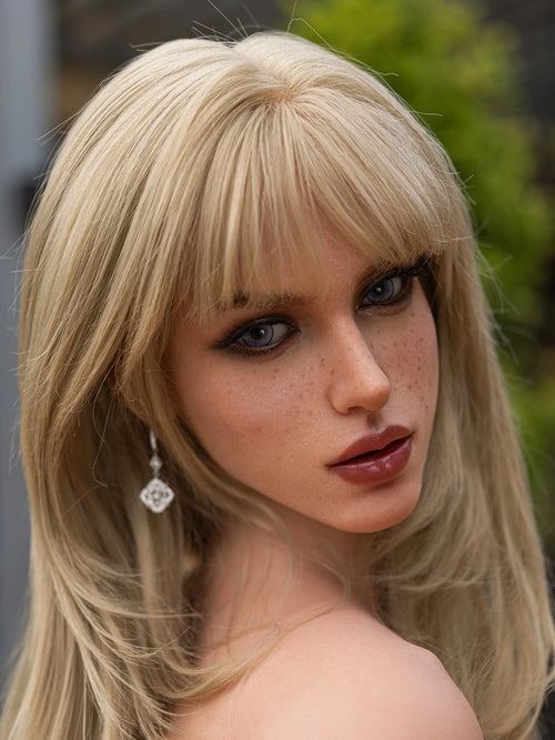 This sex doll features a meticulously crafted silicone head designed to capture subtle realism at first glance. The implanted hair follows a natural growth pattern, blending seamlessly with the scalp for an authentic look. Her blue-violet eyes carry depth and clarity, while soft freckles across the cheeks add a touch of natural imperfection. Slightly parted red lips and well-defined facial contours give her a calm, relaxed expressionโ€”one that feels present, gentle, and quietly inviting.