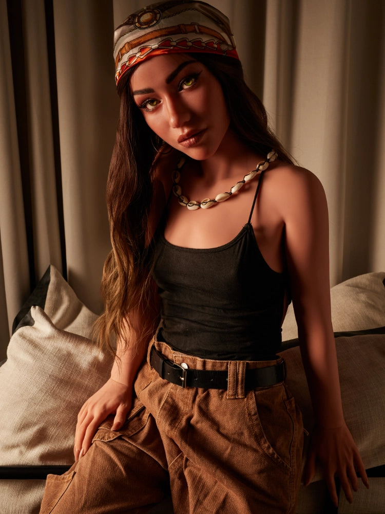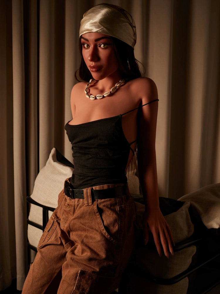 She’s got that bad girl vibe that makes every man weak — black headscarf, sharp eyes, full lips that look made for sin. Her caramel skin glows, her body moves like a rhythm you can’t escape. She’s your full size sex doll, built like a queen from the streets — fierce, filthy, and ready to ride you to the beat. When she looks at you, it’s not love. It’s a challenge.